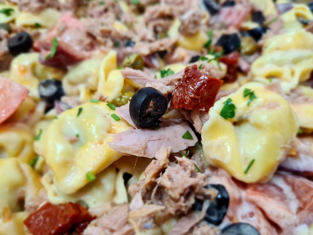 Ensalada de pasta fresca rellena de queso ricota y espinacas